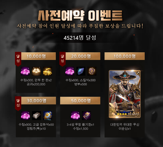 - 100,000명 달성시 : 대한민국 위대한 무신 이순신