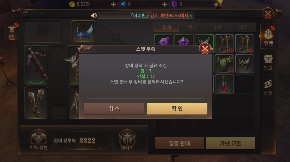 아이템을 얻고 장착을 하려고 하는데 스탯이 부족한 경우 저렇게 스탯 부족 팝업이 뜨더라고요. 게임을 하다 보면 스탯을 어떻게 찍어야 할지 고민이 될 때가 많은데요. 스탯을 잘못 찍으면 괜히 열심히 키운 캐릭터가 똥 캐릭터가 되진 않을까 걱정이 많은데, 뮤 아크엔젤에서는 장비에 맞게 스탯을 자동으로 분배를 해주다 보니 이런 고민도 없어서 정말 유저 편의성을 많이 생각했구나라고 느꼈습니다.