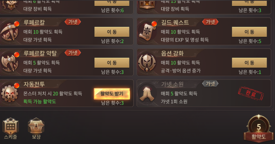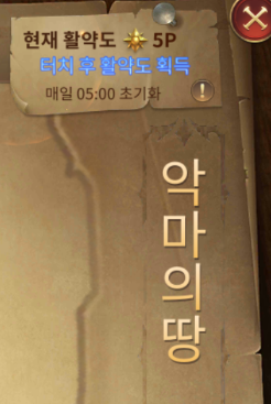 경험치 팍팍 오르는 게 보이시나요? 이렇게 좋은 콘텐츠에 당연 제한이 있겠죠. 하지만 제한도 그렇게 어려운 게 아니랍니다. 하루에 일일 퀘스트를 진행하다 보면 활약도라는 걸 보상으로 받게 되는데 활약도를 기준으로 시간을 환산합니다. 그래서 활약도가 높을수록 악마의 땅에서 사냥할 수 있는 시간이 증가하게 됩니다. 정말 콘텐츠끼리의 결합도 잘해둔 것 같은 게 악마의 땅처럼 효율 좋은 던전을 돌기 위해서는 다른 콘텐츠 플레이를 유도한다는 게 저는 정말 좋았던 것 같습니다.