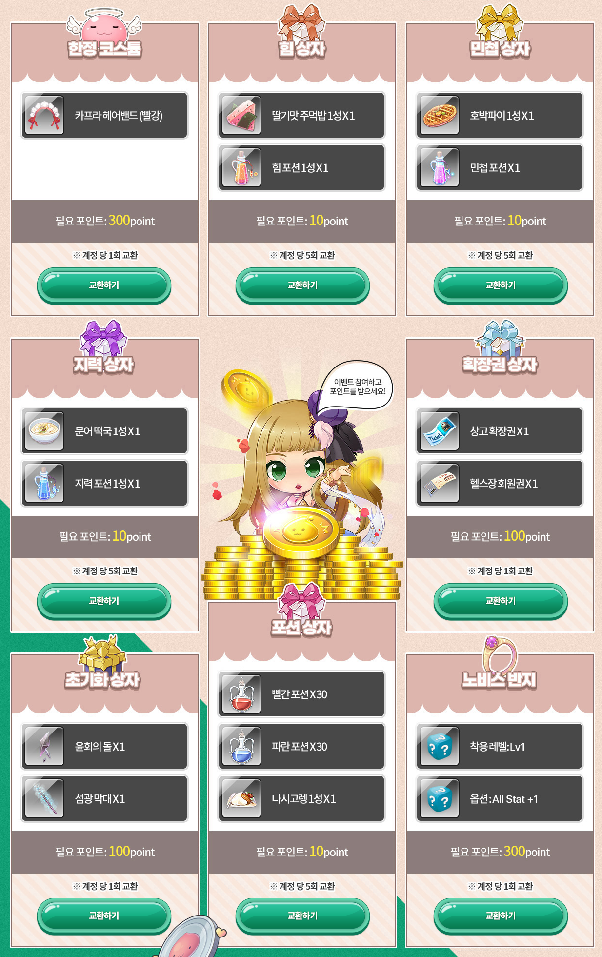 사전예약 보상이 조금 부실한 느낌이 드는데, 사전예약 보상에서 부족한 상품을 이걸로 메꾸라는 듯이 여기 상품은 그럭저럭 괜찮아 보이는 것들이 있네요. 일 단위로 포인트를 얻을 수 있다 보니 매일 사전예약 페이지에 들어와야 하는 번거로움이 있긴 하겠지만, 그래도 보상을 최대한 챙기려면 노력해야 할 것 같네요.