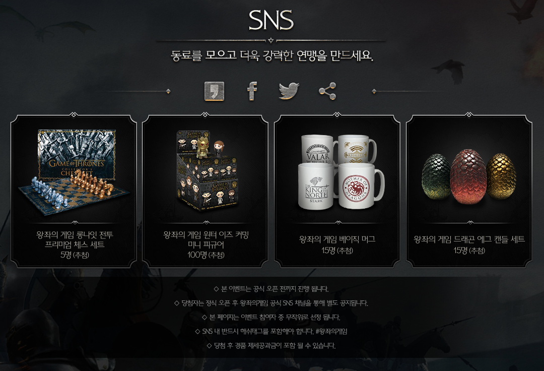 왕좌의 게임 : 윈터 이즈 커밍에서는 SNS(카카오스토리/페이스북/트위터 등) 공유 이벤트도 진행하고 있습니다. SNS 공유 시 주의할 점이 있는데, 반드시 해시태그로 #왕좌의게임을 포함하셔야지 추첨이 가능하다고 합니다. 그리고 기타 SNS(단체 카카오톡 방)에 공유를 했다면 공식 카페에 SNS 공유 게시판에 인증을 해야 추첨이 된다고 합니다. 마지막으로 해시 태그를 이용해서 공유를 한경우에는 별로도 인증을 하지 않아도 된다고 합니다. 공유하고 인증하는 경우가 많았었는데, 왕좌의 게임에서는 해시태그로 공유만 하면 된다고 하니 참여하기 수월한 것 같네요.