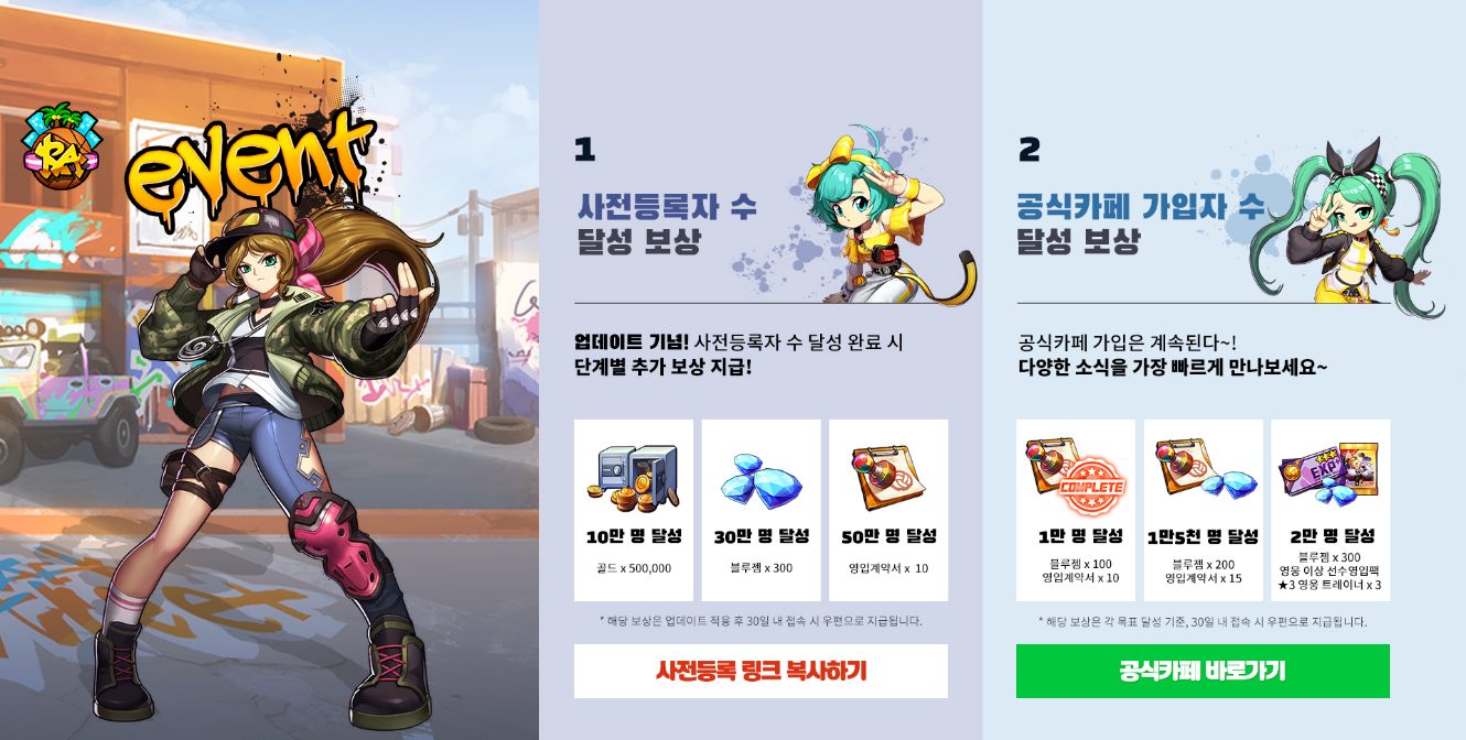 이번 Ra Street 업데이트 사전예약을 통해서 2종류의 이벤트를 진행한다고 합니다. 사전예약 등록자 수 달성에 따른 보상을 지급하는 이벤트와 공식 카페 가입자 수 달성 이벤트를 진행합니다. 사전예약 수 달성 보상은 10만, 30만, 50만 명일 때 보상이 지급된다 하고, 공식 카페 가입자 수 달성 보상은 1만, 1만 5천, 2만 명 달성할 때 보상이 지급된다고 합니다. 사전예약 수가 보이지 않아서 어느 정도 달성했는지 알 수는 없지만 카페 가입자수가 12,000명이 넘어선 걸 봐서는 충분히 50만도 가능할 것이라고 생각이 듭니다.