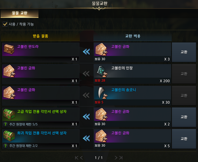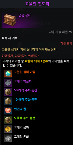 또 고블린 금화로 고급 직업 전용 각인서 선택 상자랑 희귀 직업 전용 각인서 선택 상자를 교환할 수 있습니다.