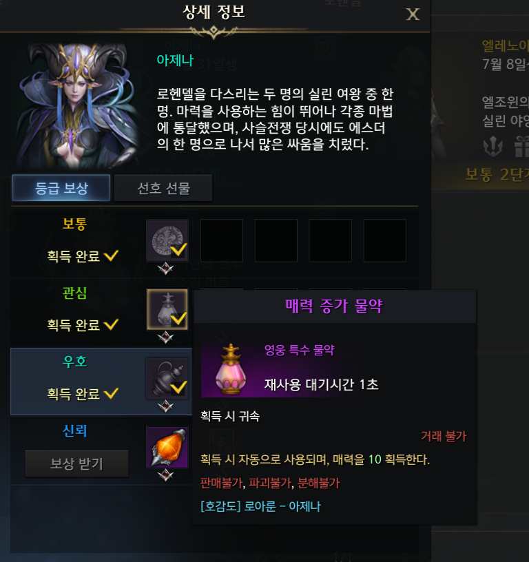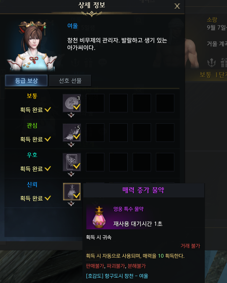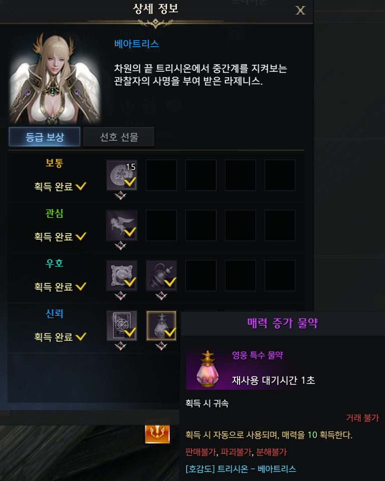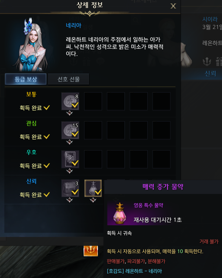 호감도에서 일정등급 이상이 되면 매력 증가 물약을 받을 수 있습니다.