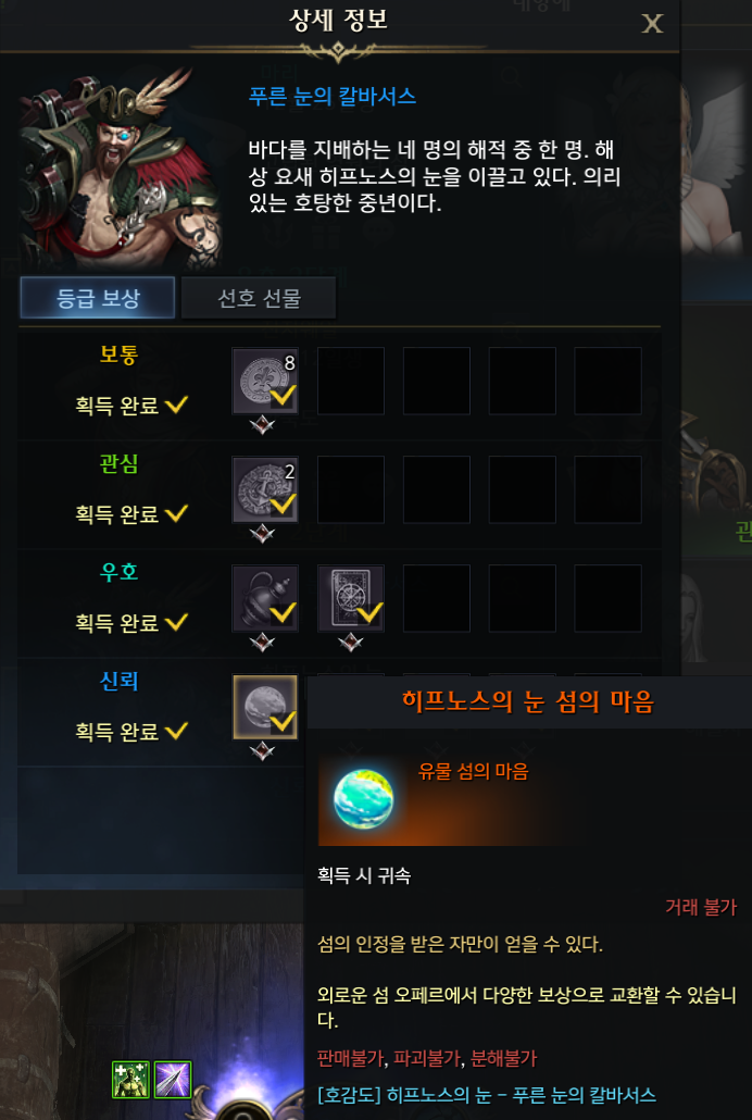 히프노스의 눈 섬의 마음은 푸른 눈의 칼바서스의 호감도 신뢰를 달성하면 획득할 수 있습니다.