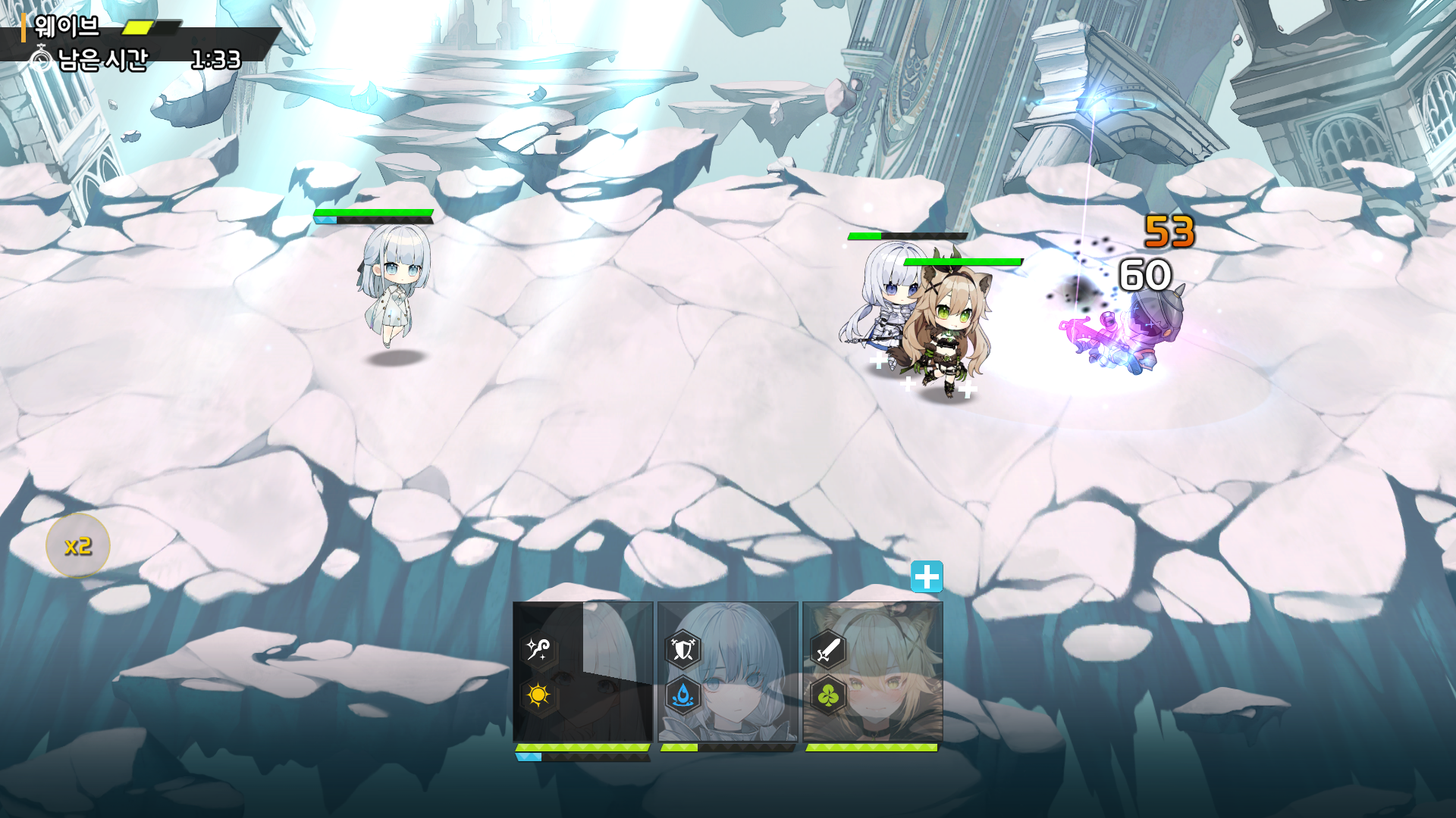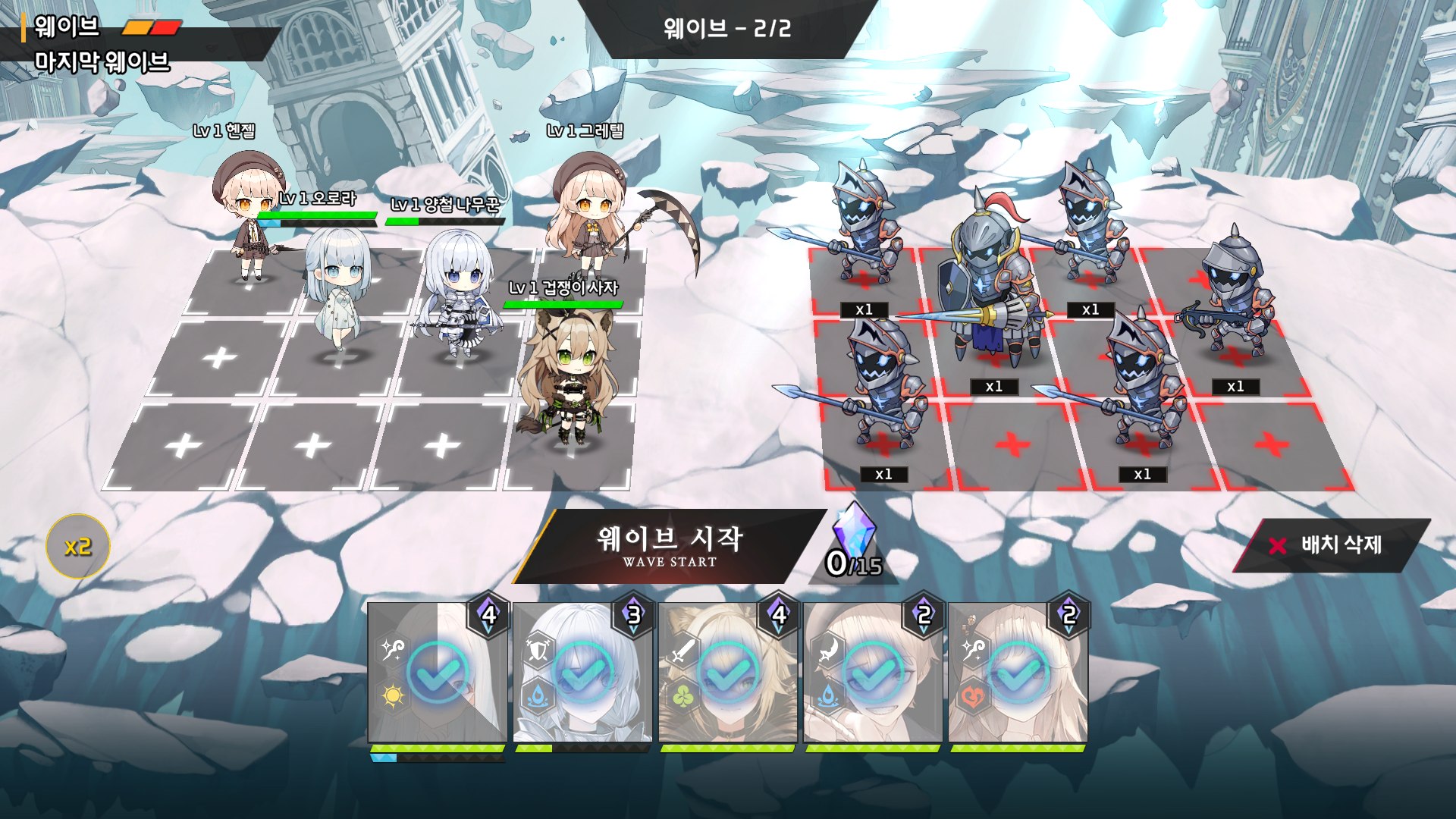 전투를 시작하기 전에 캐릭터들을 배치할 수 있습니다. 적의 위치를 보고 전략적으로 캐릭터를 배치해서 플레이하도록 되어있습니다. 그리고 웨이브 시작 버튼 우측에 수정을 보시면 숫자가 있는데 해당 숫자는 해당 웨이브에 캐릭터를 배치할 수 있는 최대 코스트를 나타냅니다. 캐릭터의 코스트는 우측 상단에 적혀있고 각 웨이브마다 정해진 코스트에 맞춰서 캐릭터를 배치하시면 됩니다. 웨이브 시작을 하게 되면 전투는 자동으로 이루어집니다.