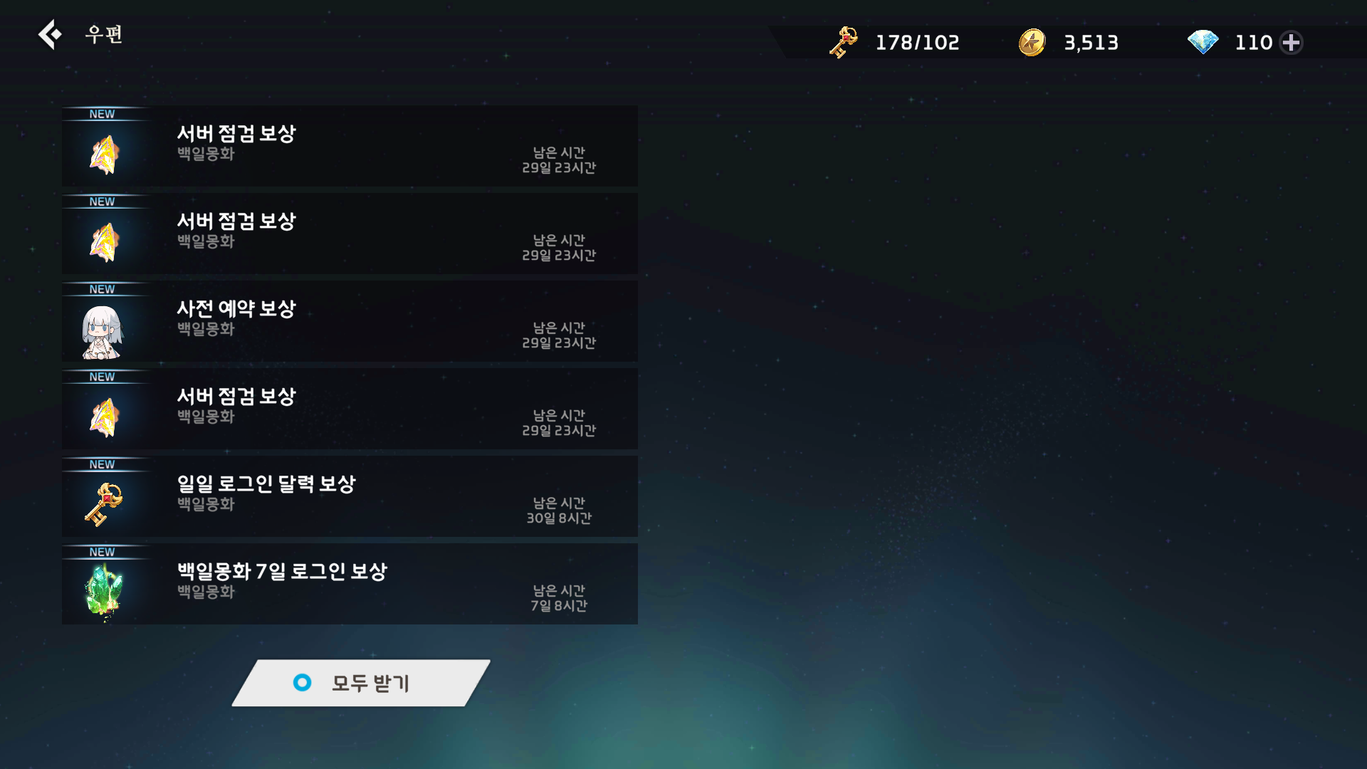 이 글 처음에도 나왔지만 백일몽화는 그전부터 제가 기다렸던 기대작 중 하나라서 오픈하면 바로 달려야지 했던 게임인데, 바로 시작하지 못했던 이유가 우편에서 볼 수 있듯이 서버 상태가 매우 매우 매우 불안하고 안 좋습니다. 안 좋습니다. 최근 어떠한 모바일 게임에서도 보지 못했을 정도로 너무 상태가 안 좋습니다. 그래서 저는 이 게임에 과금도 조금 하고 메인 게임은 아니라도 서브 게임 정도로 생각하고 꾸준히 하려고 했었지만, 적당히 참으면서 넘어갈 수 있는 수준의 상태가 아니라는 생각에 현재는 반쯤 포기한 상태입니다.
