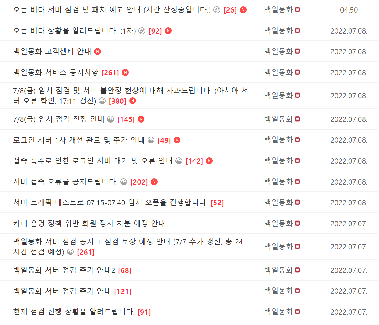 7월 7일에 오픈한 게임인데 공지사항이 이 정도로 많습니다. 제 개인적인 느낌으로 불안정하다고 생각한 것이 아니라는 증거입니다. 너무 아쉬운 점이 많은 게임입니다. 추후에 서버 안정화가 된다면 그때는 다시 플레이해볼 수도 있겠지만 현재는 이런 부분을 감안하시고 플레이를 하셔야 할 것 같습니다. 그나마 다행인 건 개발사에서도 해당 문제를 심각하게 생각해서 빠른 대응을 진행하고 있는 것 같습니다.( 환불 이슈나 현 상황에 대한 부분 등등)