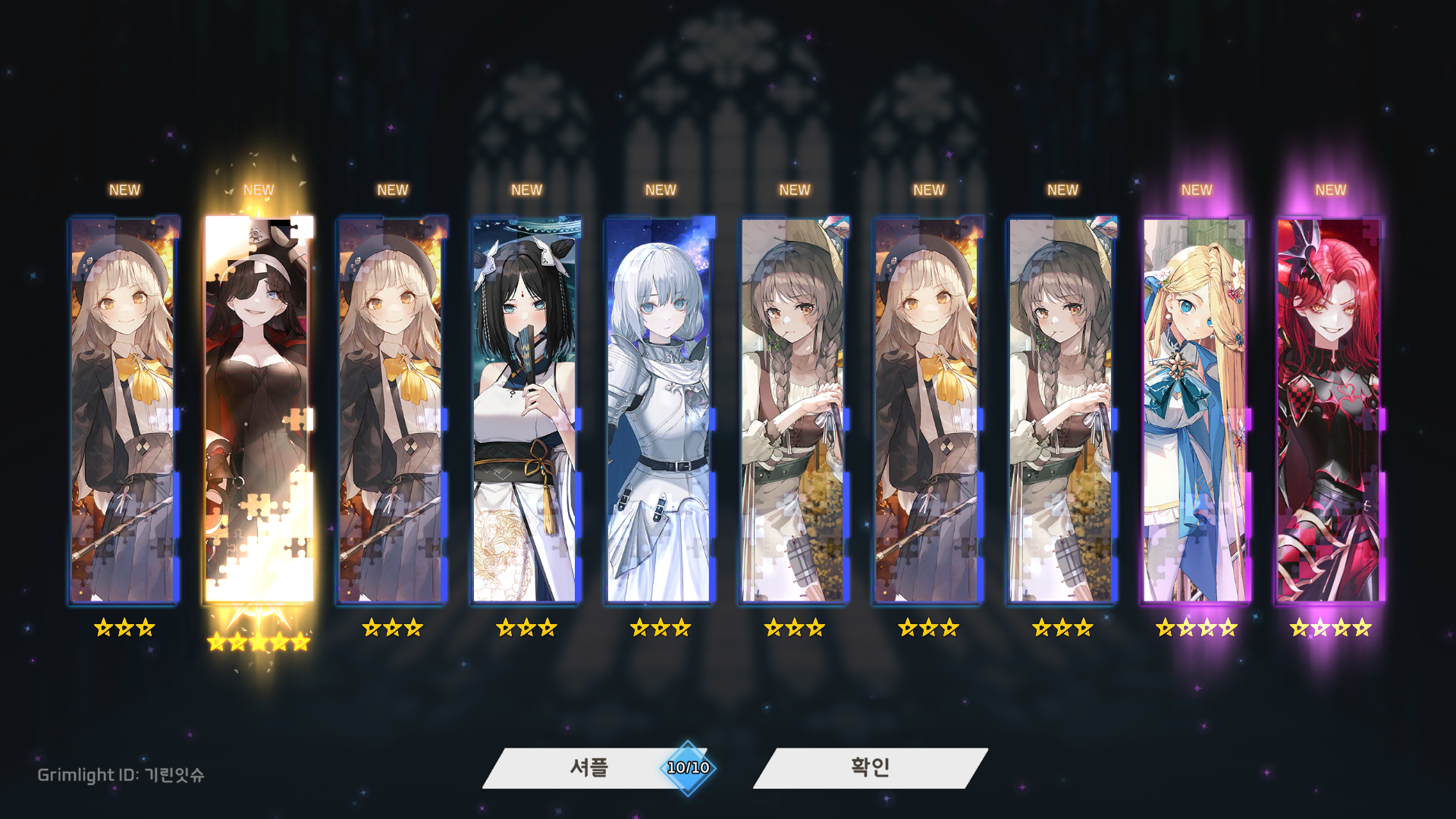 현재 뽑힌 캐릭터가 마음에 들지 않는다면 좌측에 있는 셔플 버튼을 통해서 소환된 캐릭터를 변경할 수 있습니다. 그리고 튜토리얼이라고 해서 5성 캐릭터 1개만 나오는 것이 아니라 2개 이상도 나오는 걸 확인할 수 있었습니다. 다만 셔플 횟수가 10회로 제한되어있으니 적당히 괜찮은 캐릭터가 나왔다 싶으시면 욕심부리지 않고 그대로 시작하는 걸 추천드립니다.