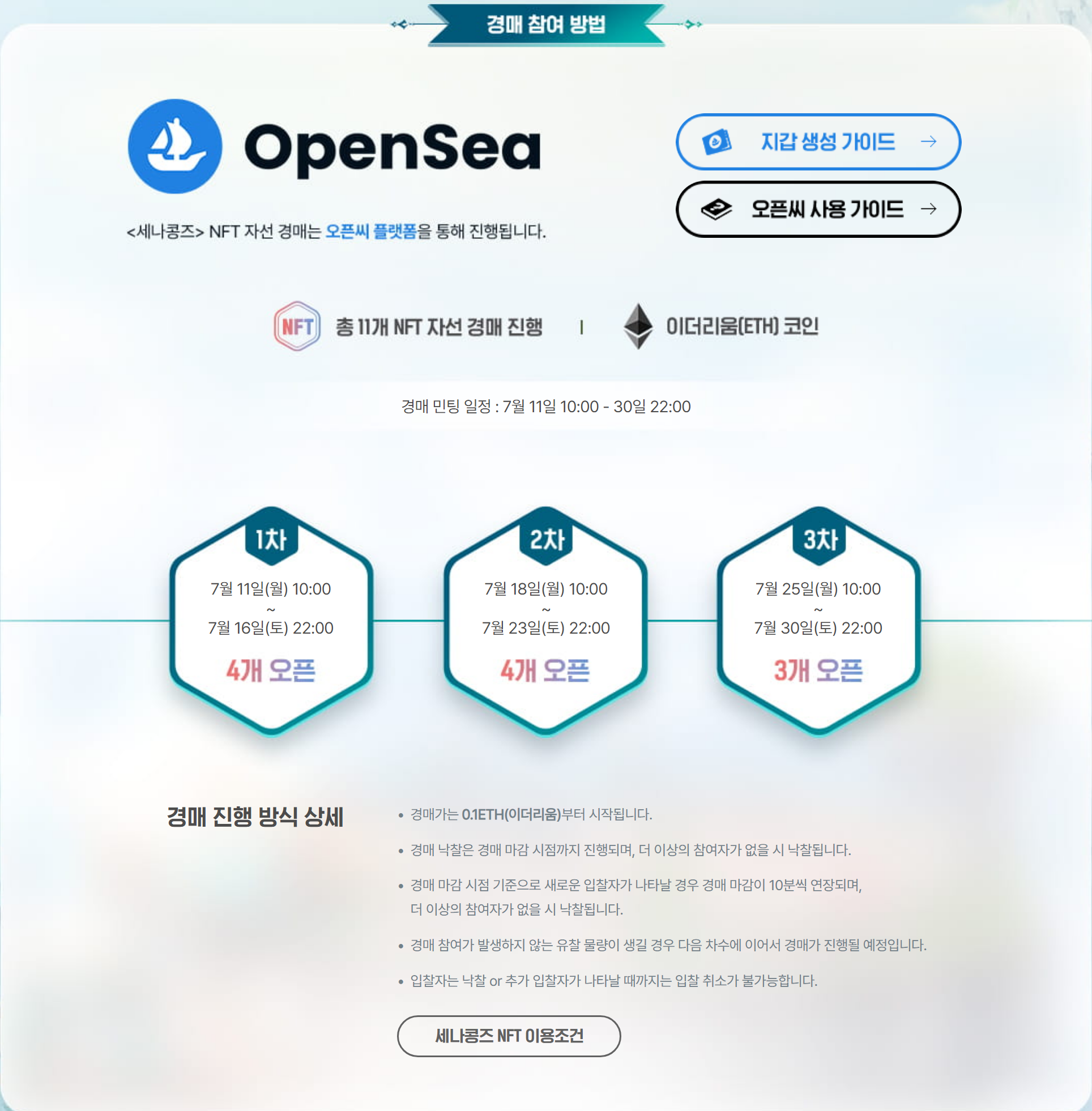 NFT 자선 경매는 세차례로 나눠서 진행이 된다고 합니다. 7월 11일부터 시작했던 이벤트라 현재는 2차 경매 진행 중입니다. 경매가는 0.1ETH(이더리움) 부터 시작된다고 하니 이더리움을 가지고 계신 분이라면 경험 삼아 한 번 참여해보는 것도 나쁘지 않을 것 같습니다.