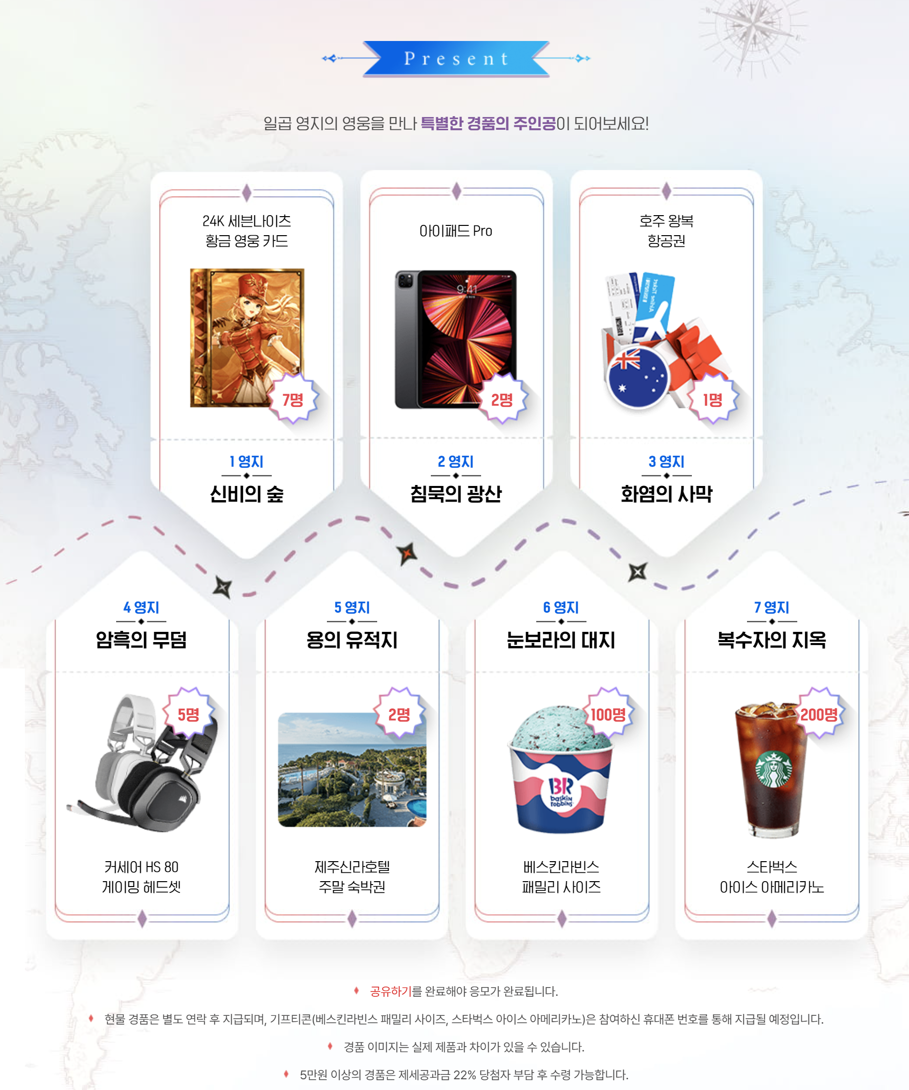 일곱 개의 영지를 돌면서 퀴즈를 풀면 되고, 각 영지 별로 24K 세븐나이츠 황금 영웅 카드, 아이패드 Pro, 호주 왕복 항공권, 스타벅스 아이스 아메리카노 등 다양한 상품을 추첨을 통해 지급한다고 합니다.