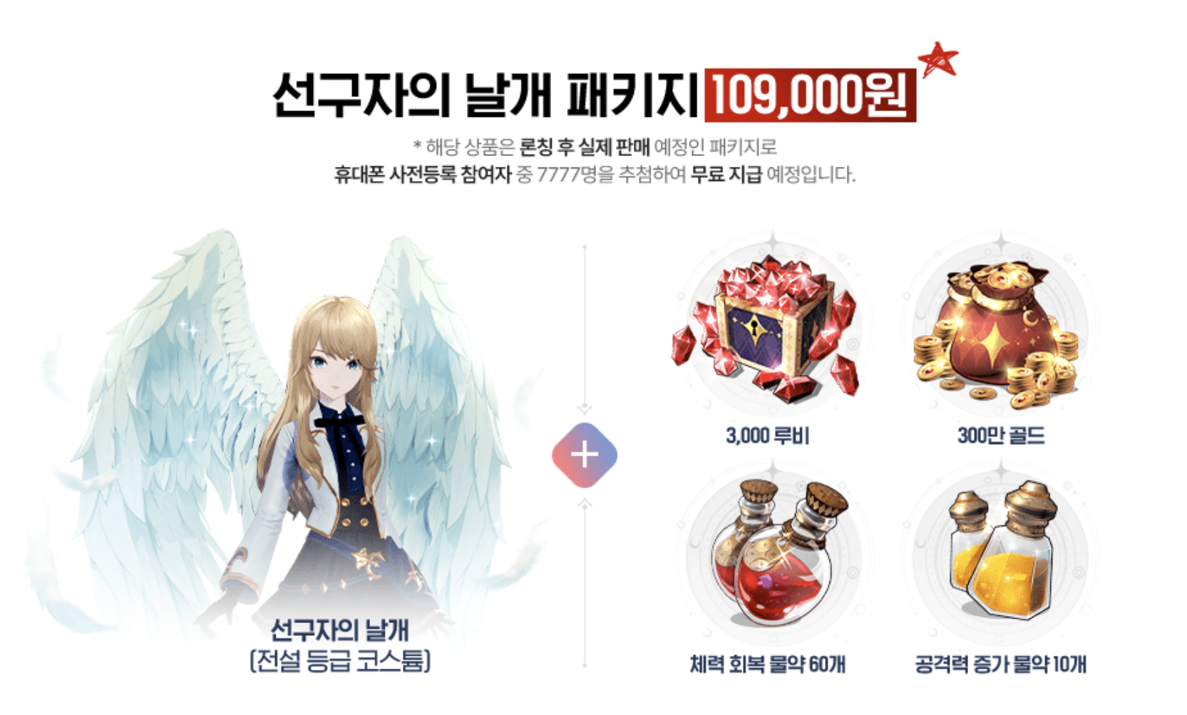 사전예약을 꼭 해야 되는 이유는 여러 가지가 있었지만, 이 상품 때문에 꼭 하라고 추천드리고 싶습니다. 여타 다른 게임들은 사전 등록 보상만 지급하고 말았지만 세나 레볼에서는 실제 게임 내에서 109,000원에 판매할 예정인 패키지 상품을 사전 예약한 유저 대상으로 7,777명에게 지급한다고 합니다. 물론 당첨될 확률이 낮을 순 있겠지만 그래도 딱히 손해 보거나 참여가 어려운 부분은 아니니까 세나 레볼은 꼭 사전예약을 해서 해당 당첨을 노려보시는 것을 추천드립니다!