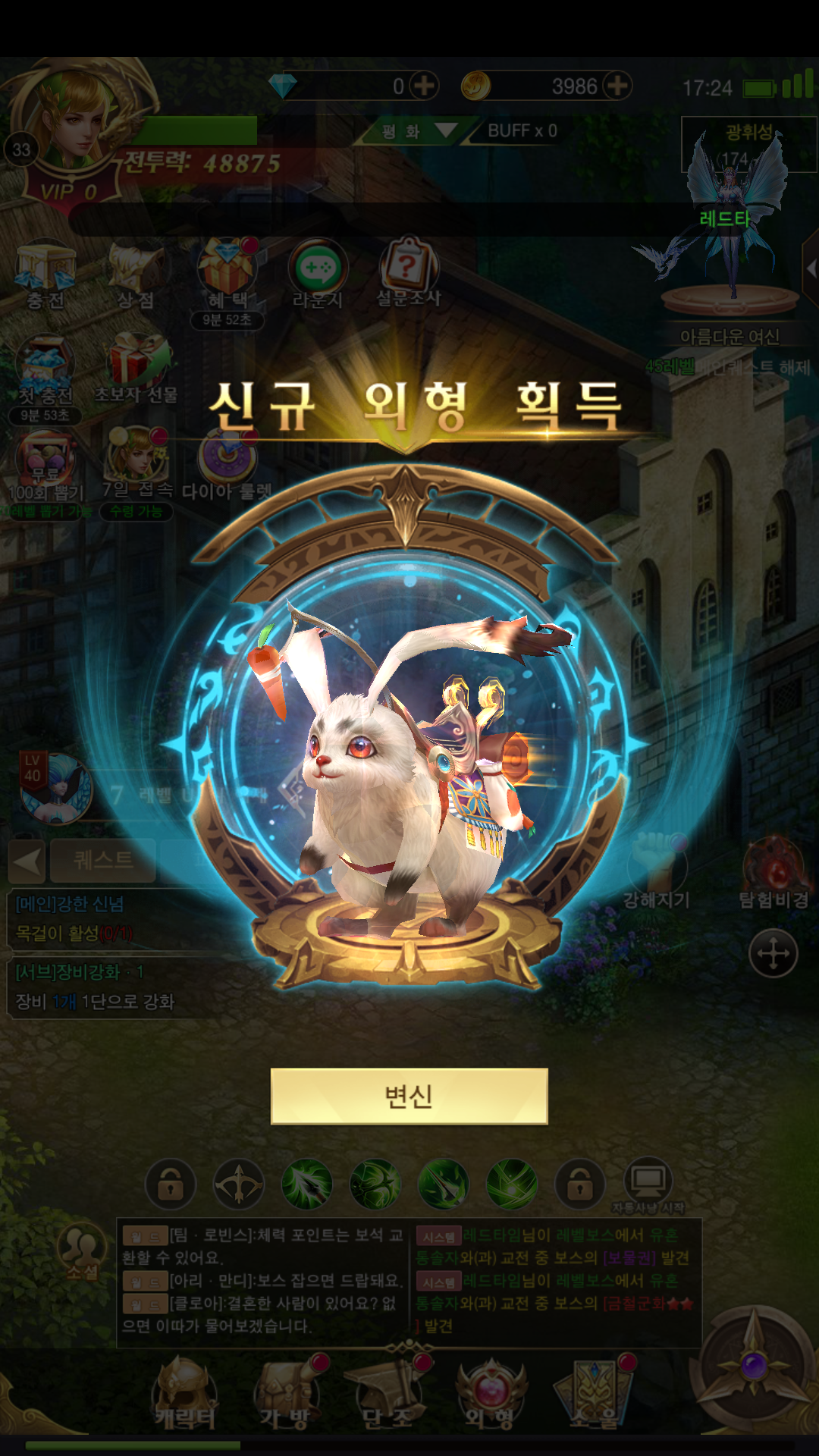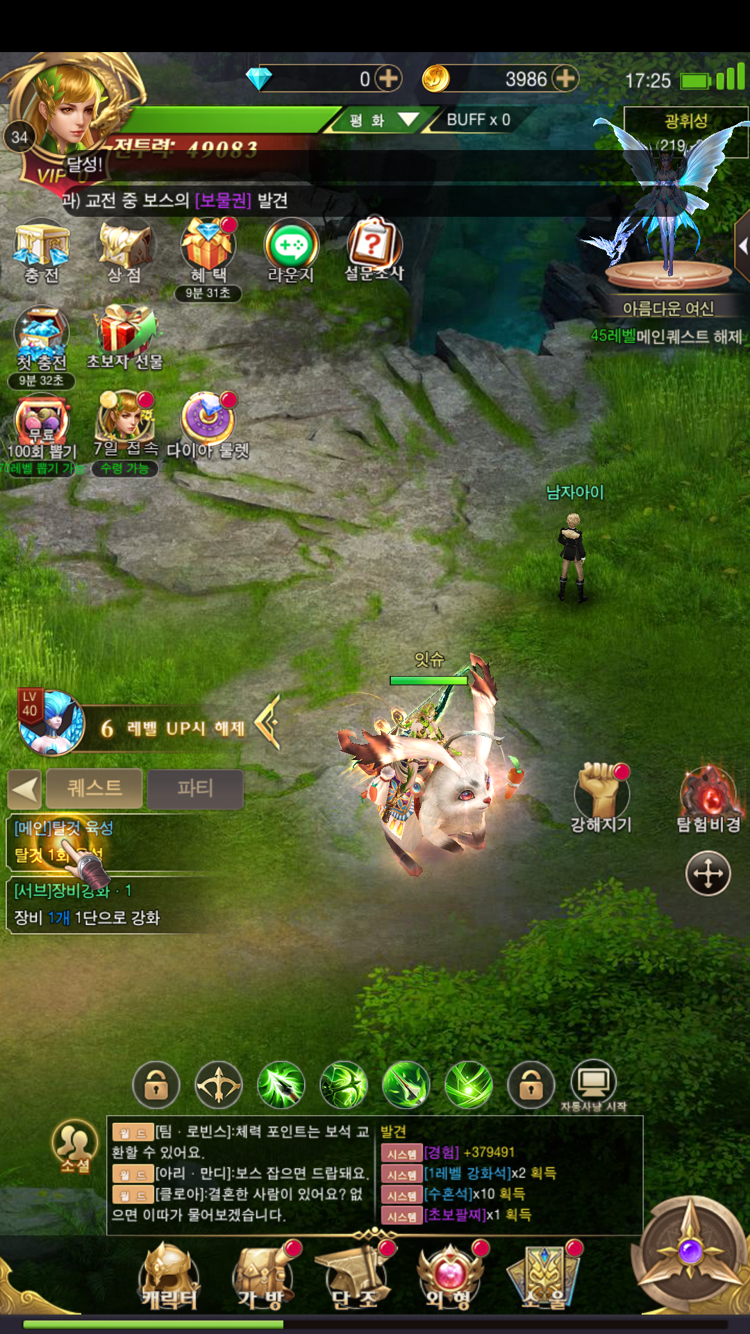 타고 다닐 수 있는 질풍 토끼를 받았을 때도 바로 강화랑 연동이 되면서 탈것을 얻은 것으로 전투력이 강해졌는데, 이걸 추가로 강화(레벨 업)까지 진행하다 보니 또 한 번 더 성장하는 체감을 느낄 수 있었습니다. 정말 다양한 획득으로 인해 성장 체감은 끊임없이 할 수 있는 것 같아서 이런 부분은 게임을 더 집중할 수 있게 만드는 요소였습니다.