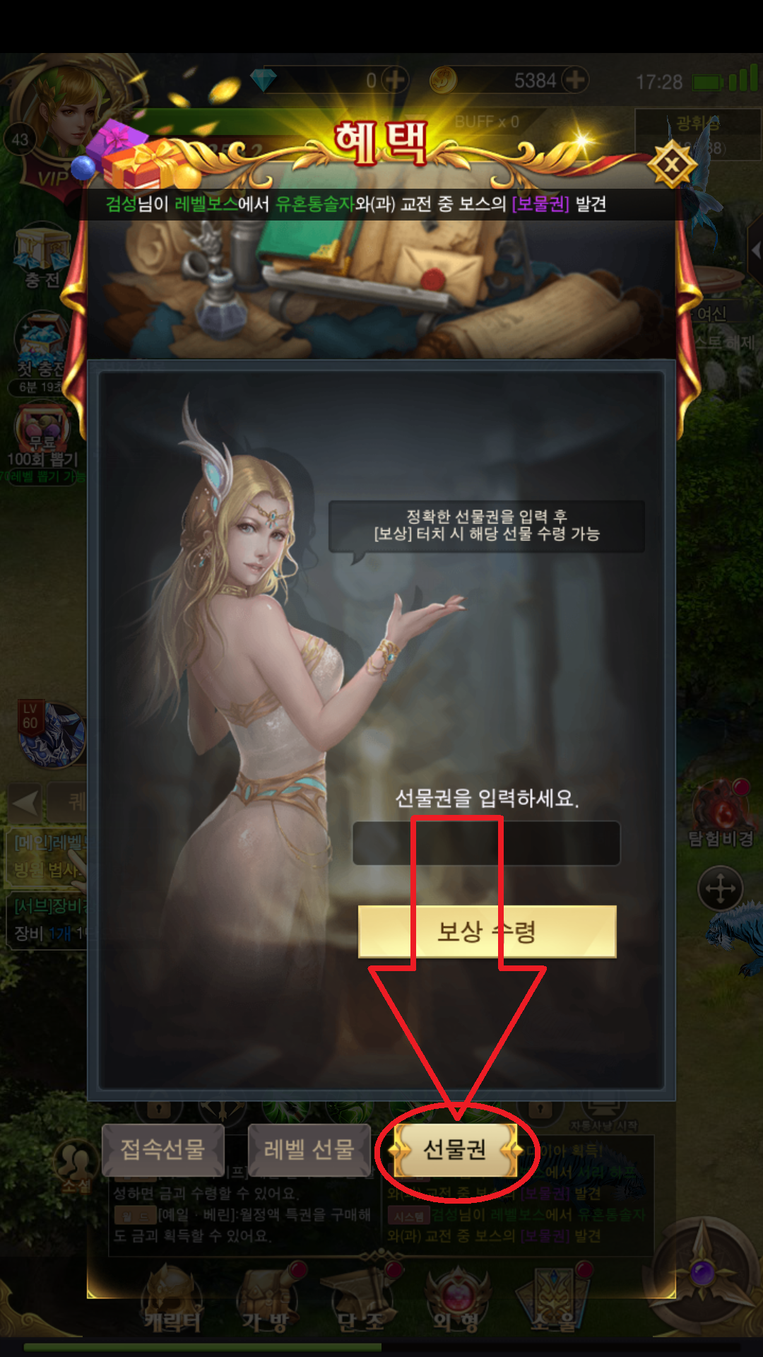 쿠폰은 좌측 상단에 있는 혜택 버튼을 누르면 팝업이 뜨고, 해당 팝업 하단에 선물권이라는 버튼을 누르면 쿠폰을 입력하는 창이 나옵니다. 여기에 쿠폰을 입력하시면 우편함으로 보상이 지급됩니다.
