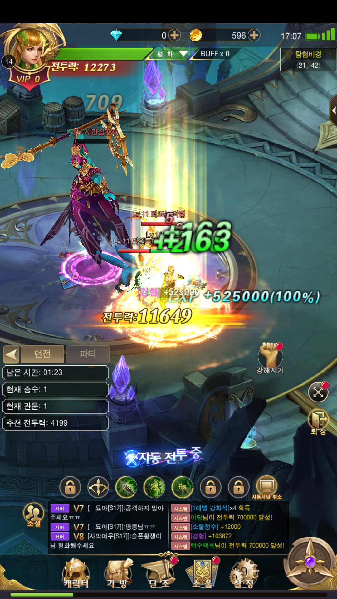 자동사냥이 있어서 퀘스트도 일정시간만 기다리면 자동으로 스토리 스킵이 되고, 전투와 보스 사냥 등등 다양한 콘텐츠가 자동으로 진행되는 걸 알 수 있었습니다. 자동 사냥이 정말 편하기는 하지만 어떻게 시스템이 돌아가는지 잘 이해가 안 되는 것과 그리고 자동으로 넘어가지 않는 부분들이 계속 있어서 완전한 자동은 아니었습니다. 이런 부분은 조금 개선이 되면 더 욱 좋지 않을까 싶습니다.