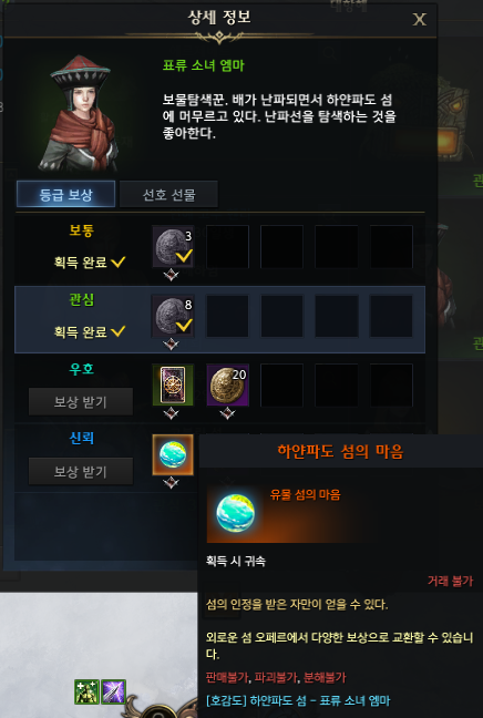 하얀파도 섬의 섬마는 NPC인 엠마의 호감도를 신뢰 달성시키면 얻을 수 있습니다.