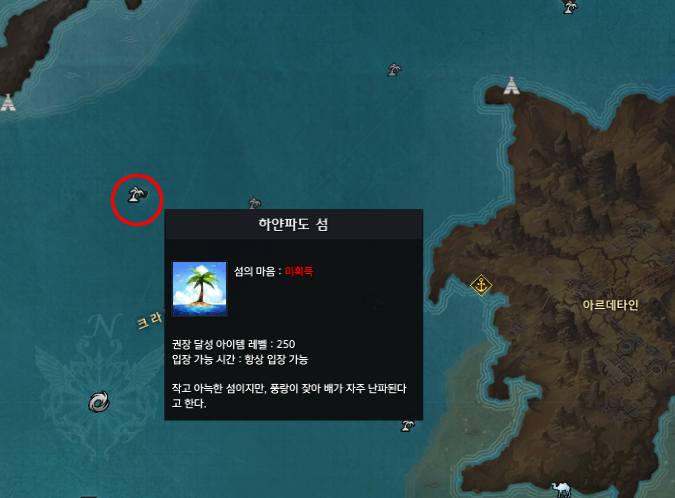 하얀파도 섬은 아르데타인 왼쪽에 위치해 있습니다.