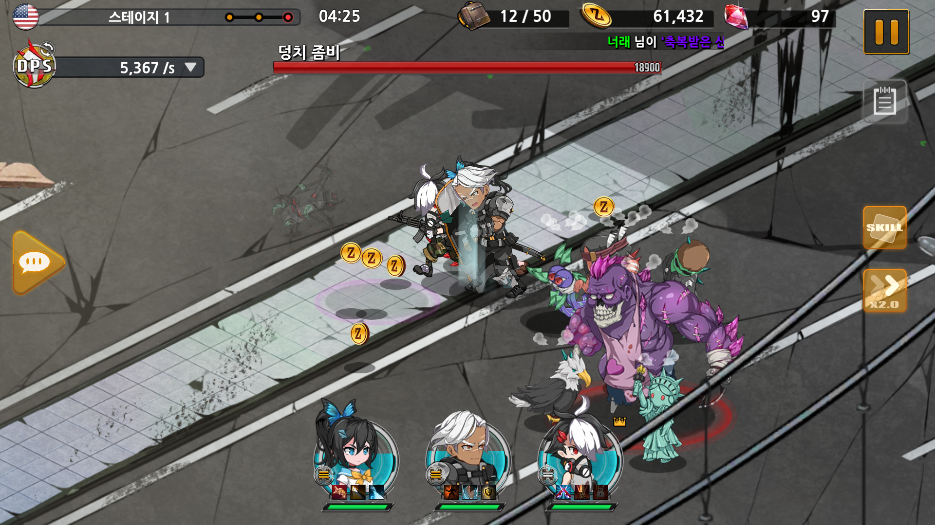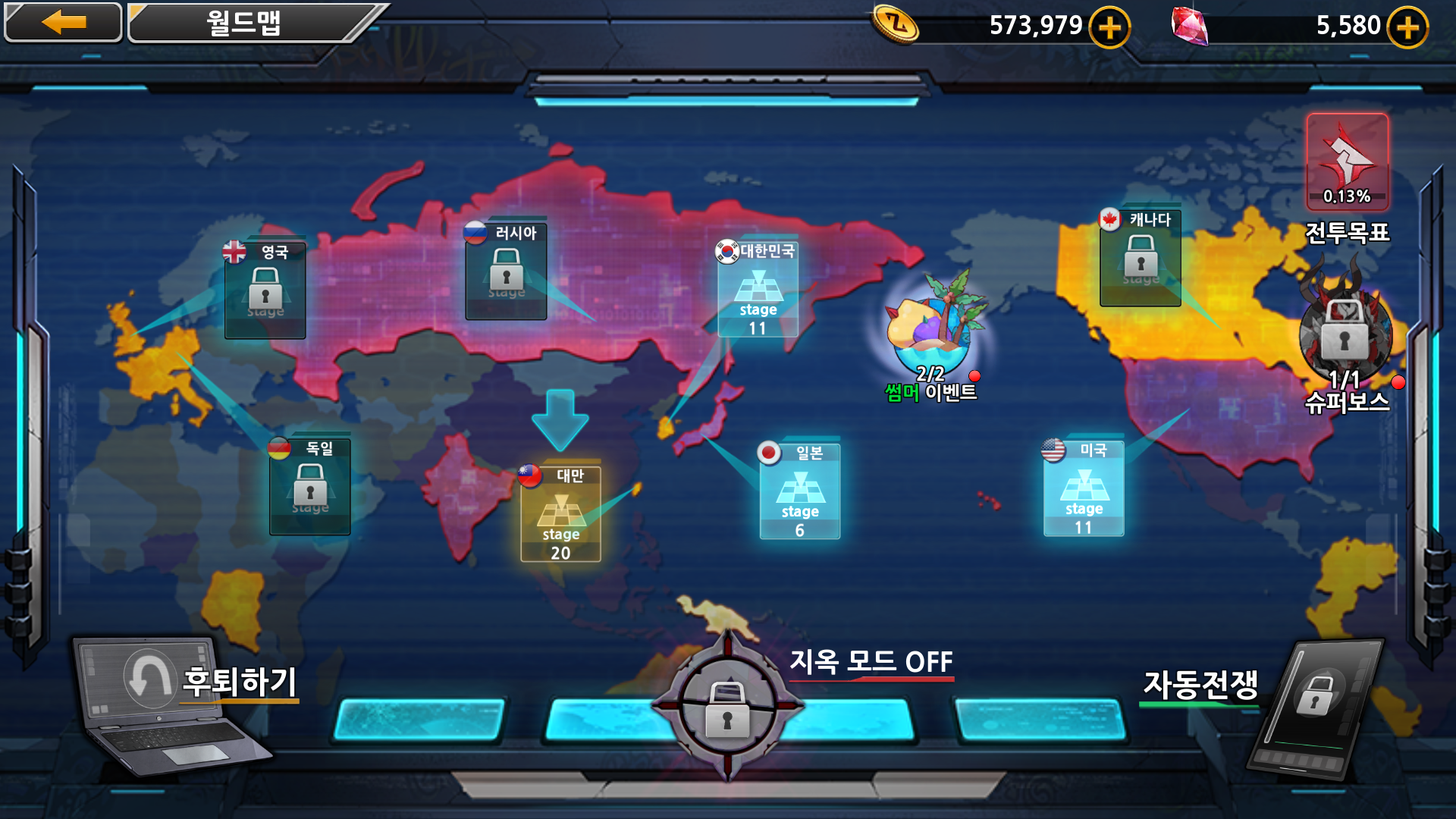이 게임도 방치형 게임이지만 일반적인 방치형과는 살짝 다른 부분이 있었습니다. 보통 방치형들은 로비화면에서 방치를 시키면서 전투를 진행하고, 다음 스테이지로 넘어가기 위한 도전 버튼을 누르면 보스전을 통해 다음 스테이지로 넘어가곤 했는데, 여기서는 월드맵을 통해 국가를 선택해서 스테이지를 들어가는 방식으로 들어가서 전투를 계속 진행하면 보스도 나오고 해당 보스를 잡으면 다음 스테이지로 넘어가고 이런 방식으로 게임이 진행됩니다.