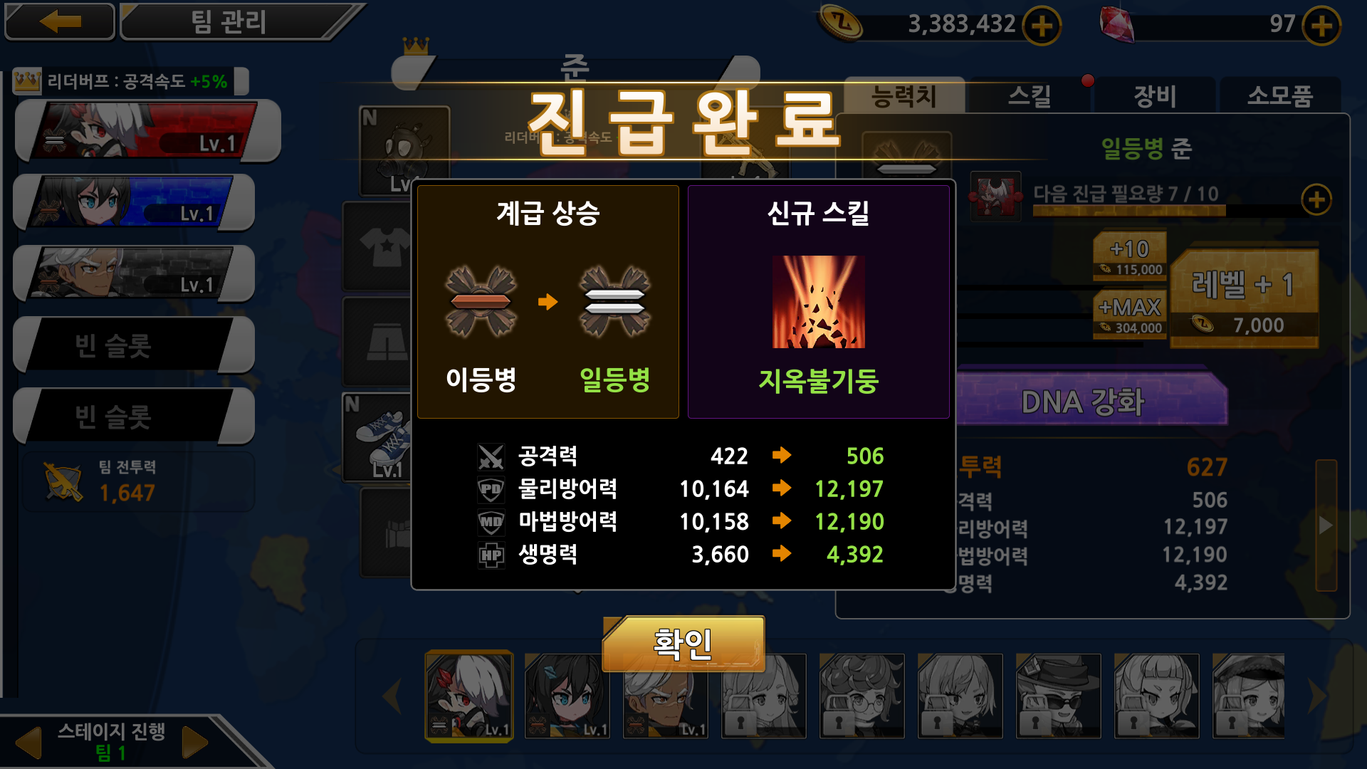 캐릭터 성장에는 여러가지 요소가 있었지만, 일단 캐릭터를 해금하는 데까지는 특정 조건 달성을 하면 되기 때문에 어려움이 크진 않았지만 이 캐릭터를 성장 시키기 위해서는 해당 캐릭터의 조각이 필요했습니다. 캐릭터 조각은 캐릭터가 성장할수록 더 많은 양이 필요했습니다. 조각을 통해 진급이라는 것을 하게되는데 진급을 하게 되면 새로운 스킬을 하나씩 얻을 수 있어서 강해졌다는 느낌을 확연하게 받을 수 있었습니다. 그래서 더 열심히 성장 시켜야겠다고 생각하게 만드는 요소였습니다.