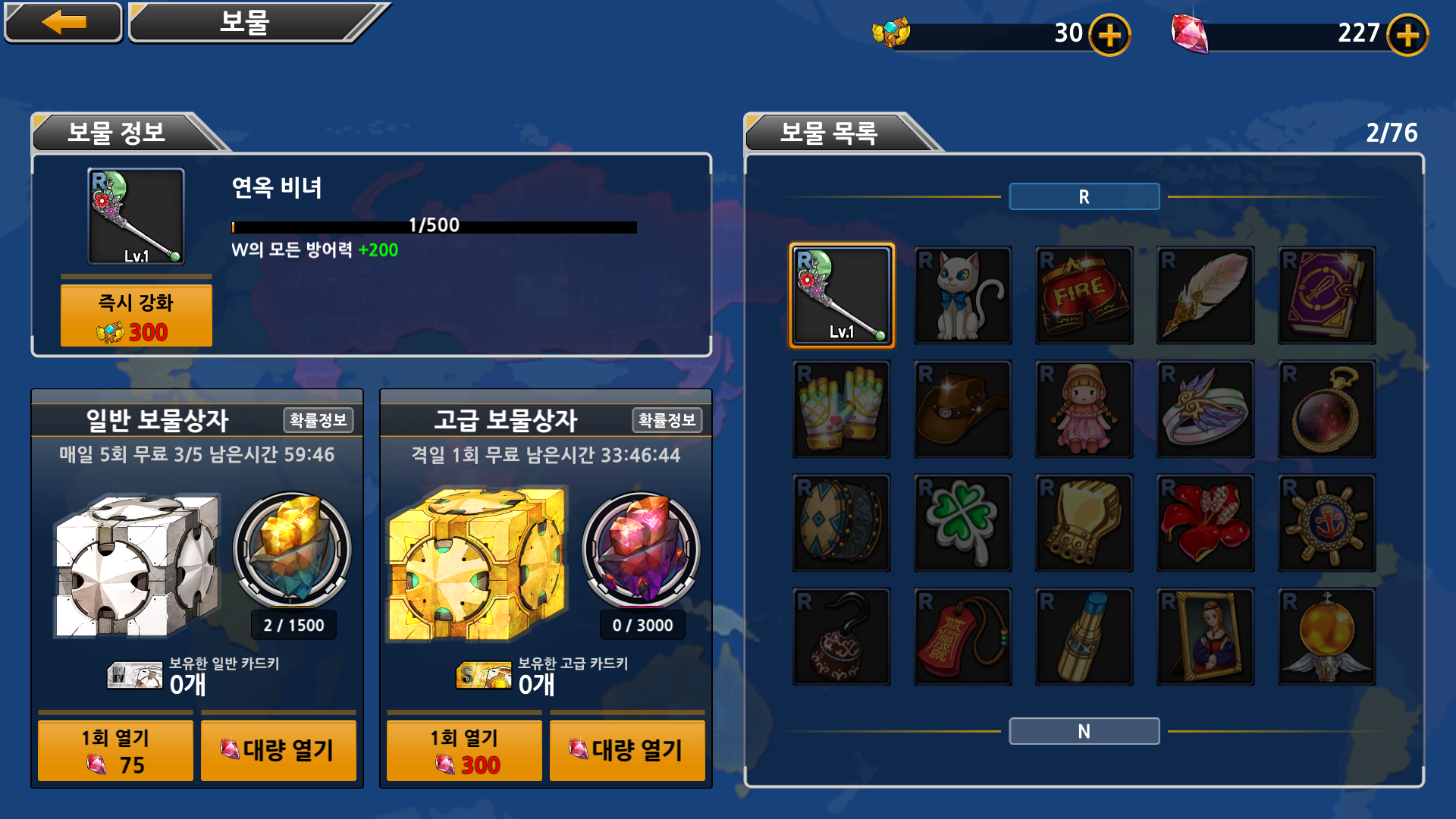 이 게임에서는 캐릭터를 뽑기 형태로 얻는 것이 아니라 특정 조건을 달성하면 자동으로 얻는 방식으로 돼있습니다. 그래서 뽑기로 캐릭터를 얻는 경우 원하는 캐릭터가 나올 때까지 뽑기를 진행해야 해서 캐릭터 성장에 있어서 상당히 어려움이 존재했었는데, 여기서는 그런 어려움은 없을 듯합니다. 하지만 뽑기는 없지는 않았습니다. 보물 시스템이라고 해서 특정 보물을 얻게되면 특정 캐릭터의 능력치가 올라가는 형태로 사실 캐릭터 성장을 시키기 위해서는 필수로 필요해 보였습니다. 결국 해당 캐릭터가 강해져서 주로 사용하는 캐릭터가 되기 위해서는 보물을 뽑아야 했습니다.