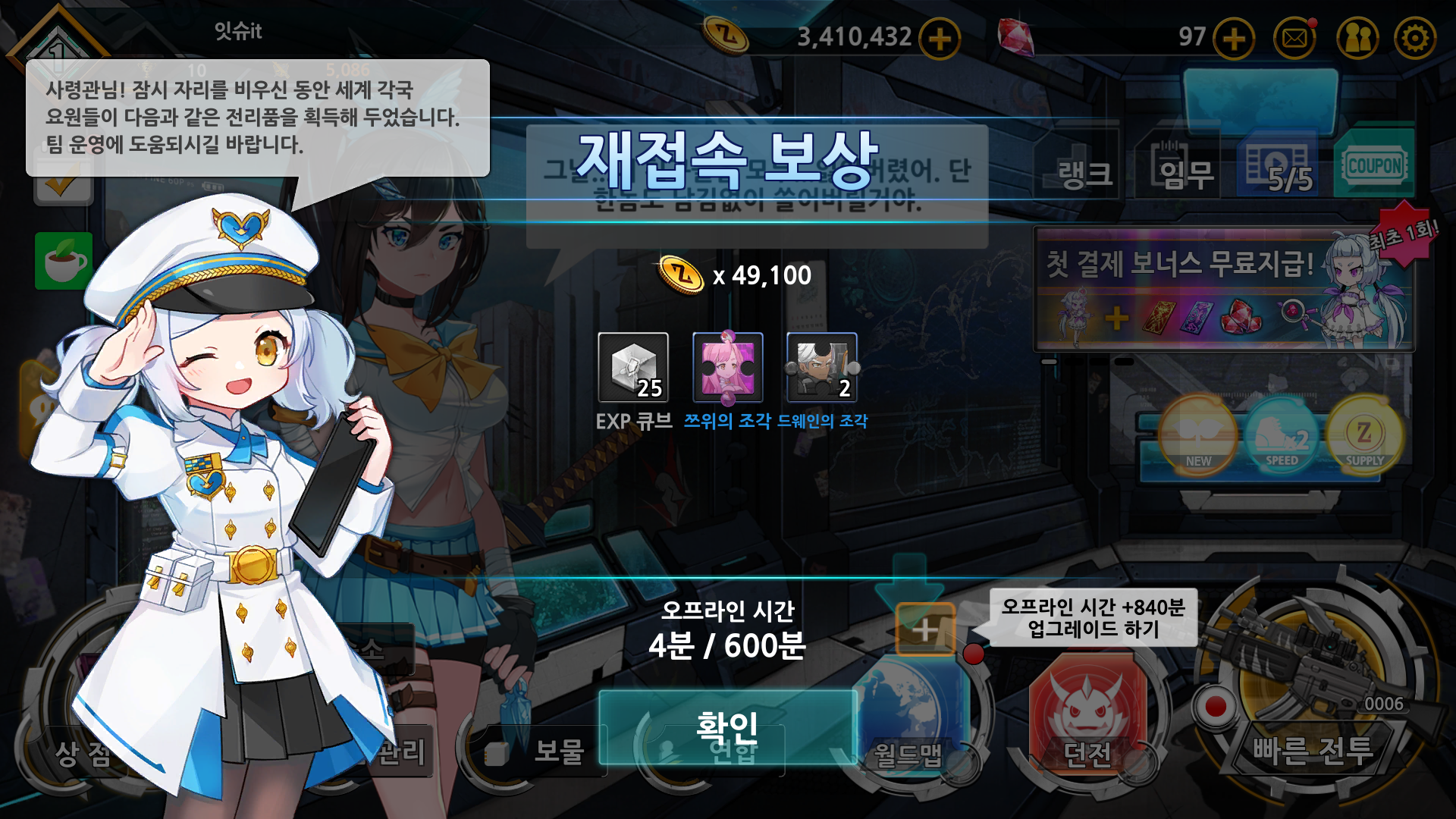 방치형 게임을 하게 되는 이유가 꼭 게임을 직접 플레이하지 않아도 성장시킬 수 있다는 것 때문에 하기도 합니다. 이 게임에서도 게임 접속을 종료하게 되면 재접속 보상이라는 팝업이 뜨면서 일정 시간 동안 쌓이는지 나오면서 보상을 지급하게 됩니다. 플레이를 하지 않아도 보상을 받을 수있는 이런 시스템 덕분에 방치형 게임을 하는 것 아닌가 싶습니다.