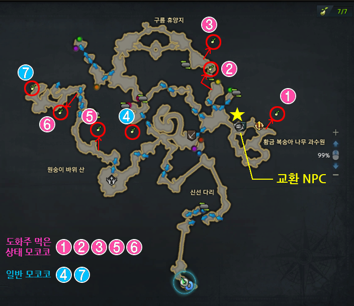 모코코가 총 7개인데 그 중 5개는 도화주를 먹은 상태에서 찾아야됩니다.