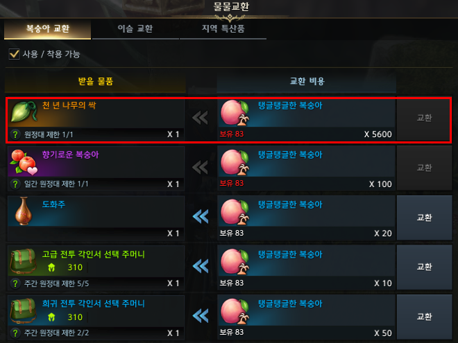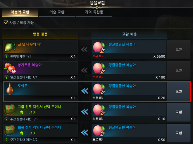 도화주는 물물교환 NPC에게서 구입할 수 있는데 탱글탱글한 복숭아 20개로 교환할 수 있습니다.
