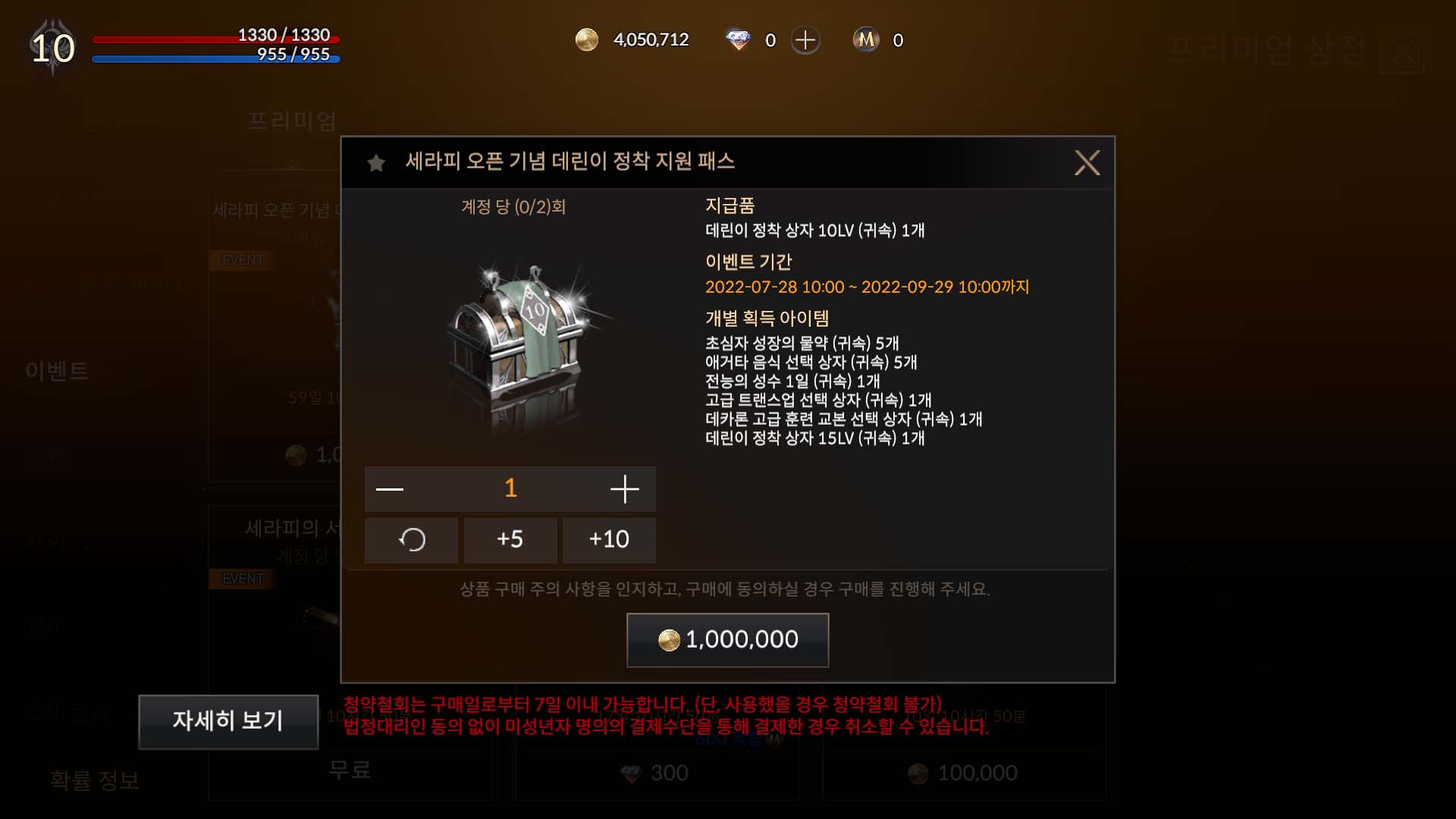 공식 홈페이지에서 내용을 확인하고 상점에서 이벤트 탭으로 가니 100만 딜에 판매하고 있는 상품을 볼 수 있었습니다. 다만 레벨 제한(10)이 있어서 바로 구매는 불가능했습니다. 딜(게임 재화)은 충분해서 따로 모으지 않아도 구매가 가능했습니다. 레벨 10까지는 5~10분 정도면 충분히 키울 수 있는 레벨이었습니다. 해당 상자를 까 보면 레벨에 해당하는 보상과 다음 보상 상자를 같이 지급합니다. 이렇게 성장을 유도하는 방식은 나쁘지 않았습니다.