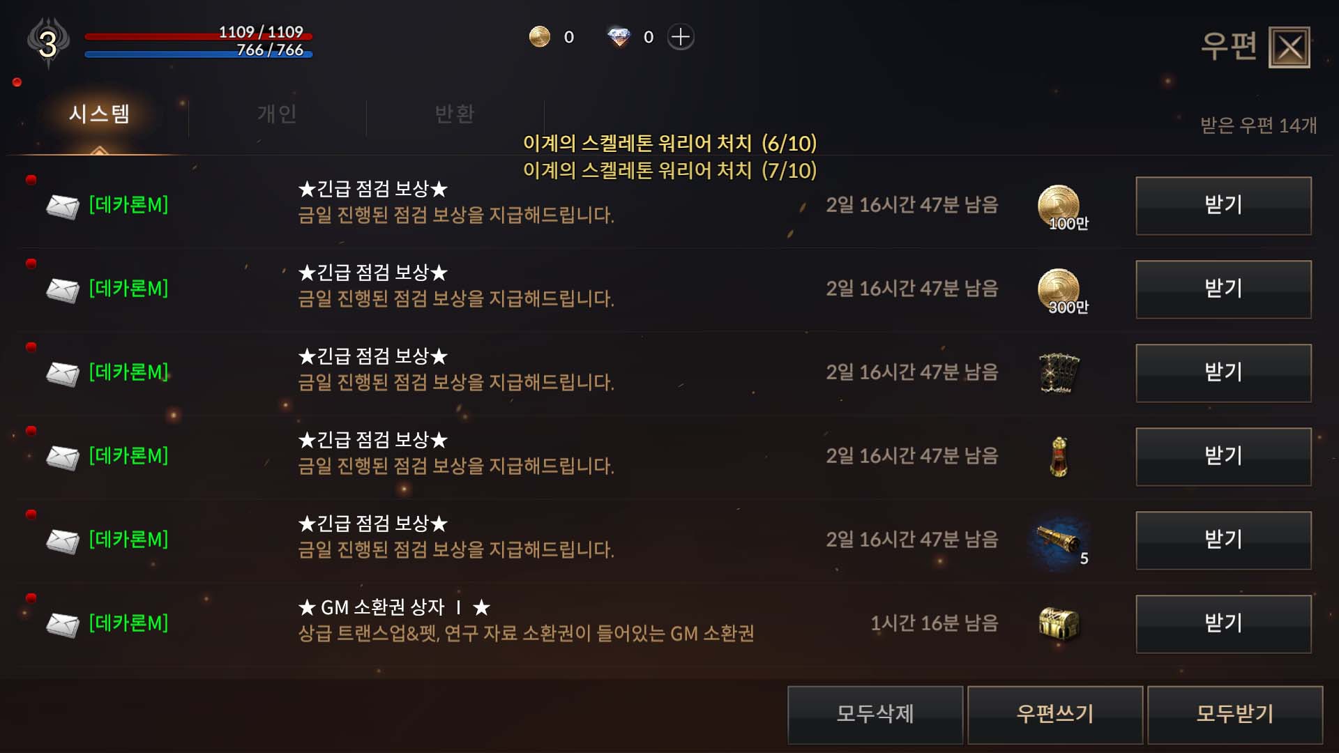 역대급 보상을 찾기 위해 고군분투했지만 쉽게 찾을 수 없었습니다. 그러다가 우측 상단에 메뉴를 눌러보니 우편함에 빨간 점이 찍혀있어서 눌러봤습니다. 위 사진과 같은 보상들이 들어 있었지만, 역대급 보상이라고 하기에는 살짝 부족해 보였습니다.