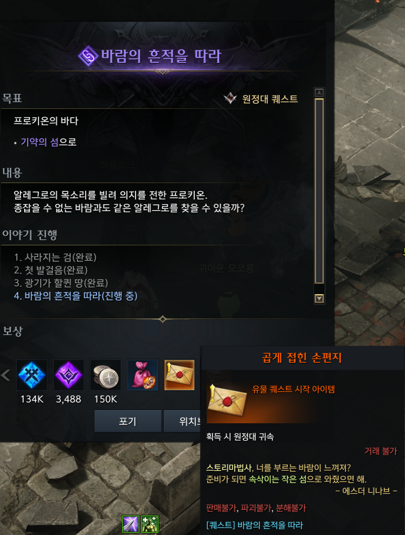 마지막으로 [바람의 흔적을 따라] 퀘스트를 진행하면 바로 이 퀘스트의 보상으로