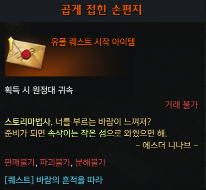 또, 퀘스트를 통해 얻은 곱게 접은 손편지는 에버그레이스의 둥지 섬의 마음 선행퀘스트에 꼭 필요한