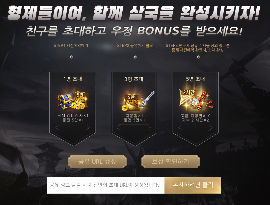 관도:삼국지에서는 자신만의 URL 링크를 생성해서 해당 링크로 친구 초대하는 이벤트를 진행하고 있습니다. 생성된 URL을 통해서 친구가 사전예약을 하게 되면 초대 인원에 비례해서 보상을 지급하는 이벤트입니다.